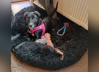 Mit dem Ersthund der Familie versteht sie sich gut und bleibt mit ihm auch 1–2 Stunden alleine.
